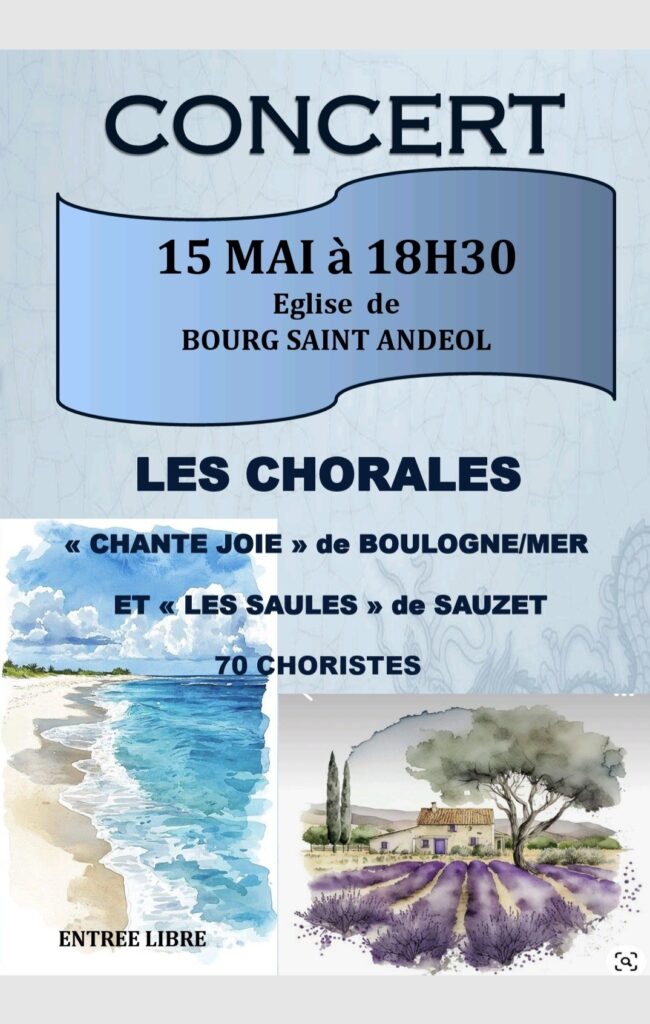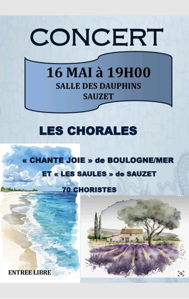 Nous donnons des concerts à Sauzet mais aussi dans les villes et villages voisins. La chorale Les Saules donne aussi des concerts caritatifs et chantent au profit d’organisations telles que les Restos du Cœur, l’association Alzheimer, le Téléthon ou encore l’association Arc en Ciel de Villeneuve de Berg.